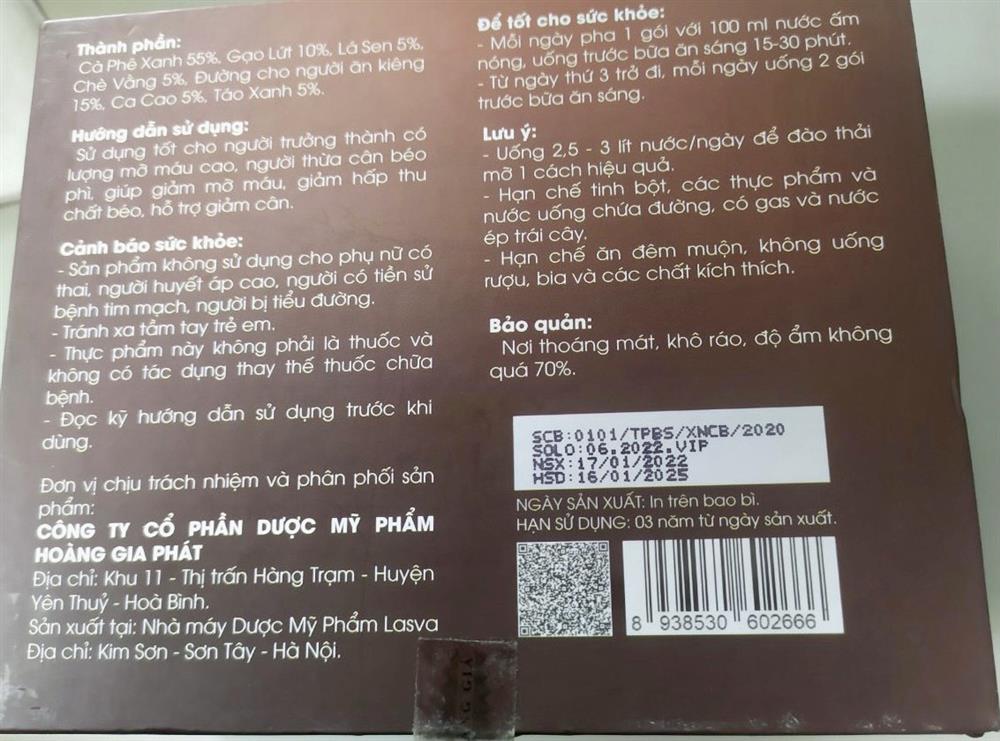 Qua tìm hiểu, được biết sản phẩm thực phẩm bổ sung cafe Hoàng Gia do Công ty TNHH dược mỹ phẩm Lasva, địa chỉ: xã Kim Sơn, thị xã Sơn Tây, thành phố Hà Nội (nay đổi tên thành Công ty TNHH nghiên cứu và phát triển dược mỹ phẩm Thịnh Việt Pharma, địa chỉ: Thôn Kim Đái 1, xã Kim Sơn, thị xã Sơn Tây, thành phố Hà Nội) tự công bố và sản xuất sản phẩm. Đơn vị chịu trách nhiệm và phân phối sản phẩm: Công ty cổ phần dược mỹ phẩm Hoàng Gia Phát, địa chỉ: Khu 11, thị trấn Hàng Trạm, huyện Yên Thuỷ, tỉnh Hoà Bình.