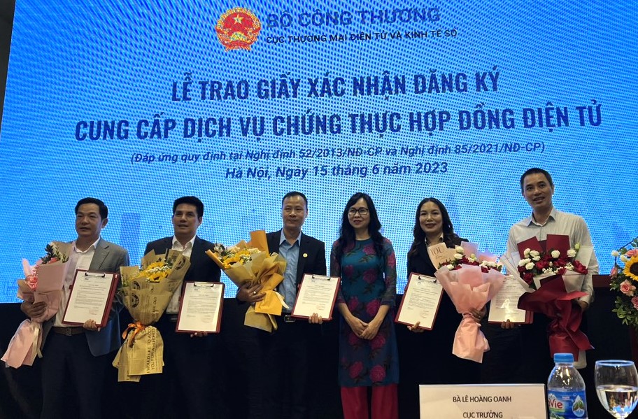 Năm 2022, Bộ Công Thương đã ban hành thông tư quy định các hướng dẫn đối với quy chế hoạt động cung cấp dịch vụ chứng thực HĐĐT; hình thức công bố danh sách các thương nhân, tổ chức cung cấp dịch vụ chứng thực HĐĐT tại Việt Nam. Đến tháng 6/2023, Bộ Công Thương (Cục Thương mại điện tử và Kinh tế số) đã tiến hành rà soát hệ thống, thẩm định hồ sơ đề án và xác nhận đủ điều kiện cung cấp dịch vụ chứng thực hợp đồng điện tử cho các đơn vị: Công ty TNHH Hệ thống Thông tin FPT; Tổng Công ty viễn thông Viettel; Công ty Cổ phần BKAV; Tổng Công ty Viễn thông Mobiphone; Công ty TNHH Tổng Công ty công nghệ và giải pháp CMC, Tập đoàn Bưu chính viễn thông Việt Nam, Công ty cổ phần Giải pháp thanh toán Việt Nam VNPay, Công ty cổ phần MISA, Công ty cổ phần Savis, Công ty cổ phần Công nghệ tin học EFY Việt Nam.