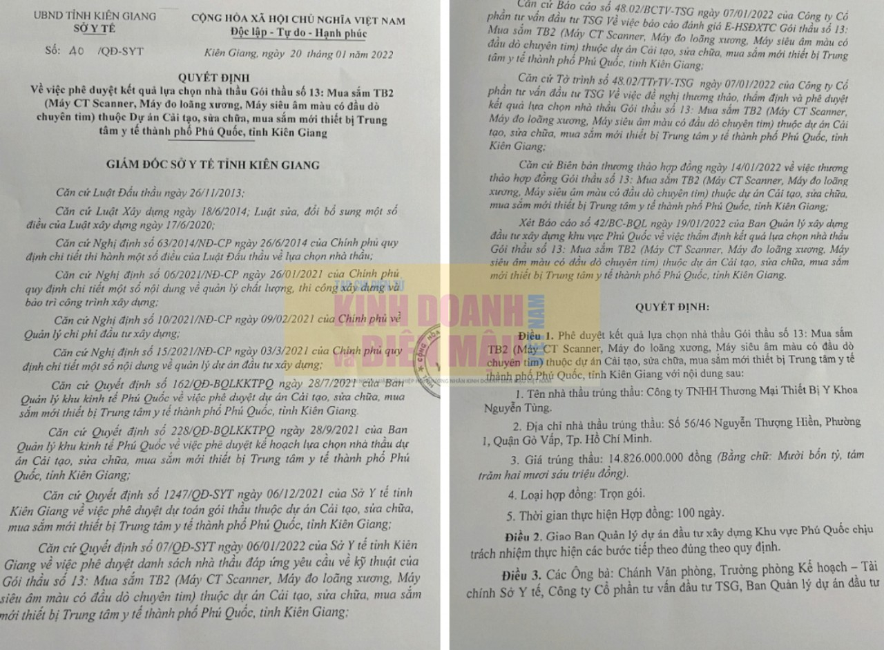 Ngày 20/01/2022, ông Hà Văn Phúc, Giám đốc Sở Y tế tỉnh Kiên Giang đã ký Quyết định số 40/QĐ-SYT để phê duyệt cho Công ty TNHH Thương Mại Thiết Bị Y khoa Nguyễn Tùng trúng “Gói thầu số 13: Mua sắm TB2 (Máy CT Scanner, Máy đo loãng xương, Máy siêu âm màu có đầu dò chuyên tim) thuộc dự án cải tạo, sửa chữa, mua sắm mới thiết bị Trung tâm y tế TP. Phú Quốc” trị giá 14.826.000.000 đồng.