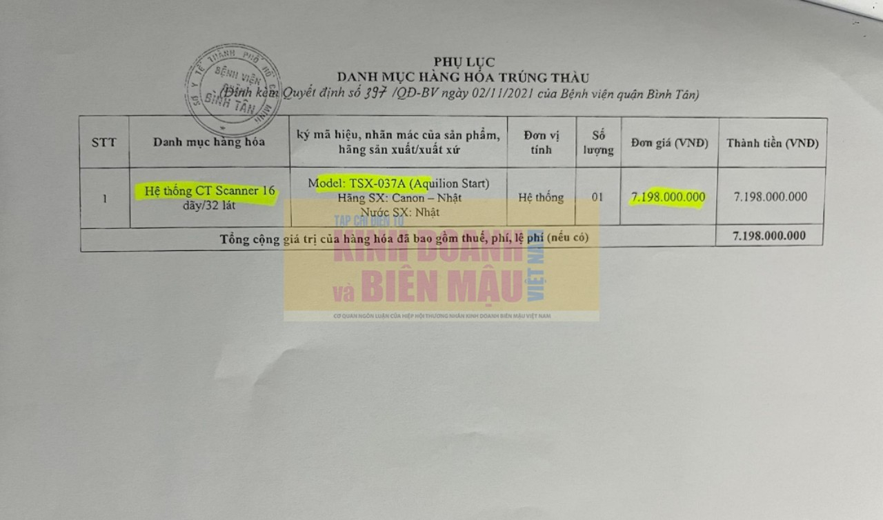 Không chỉ vậy, thiết bị tại gói thầu mà Công ty Nguyễn Tùng bán cho Kiên Giang lại có giá cao hơn so với nhiều địa phương khác. Ví dụ, máy CT Scanner (Model: TSX-037A (AQUILION START)/CANON/NHẬT) nếu Sở Y tế Kiên Giang phải mua với giá là 10.380.000.000 đồng thì vào ngày 02/11/2021, Bệnh viện quận Bình Tân (TP.HCM) lại chỉ mua đúng thiết bị (có trùng model, xuất xứ, nguồn gốc) với giá là 7.198.000.000 đồng.