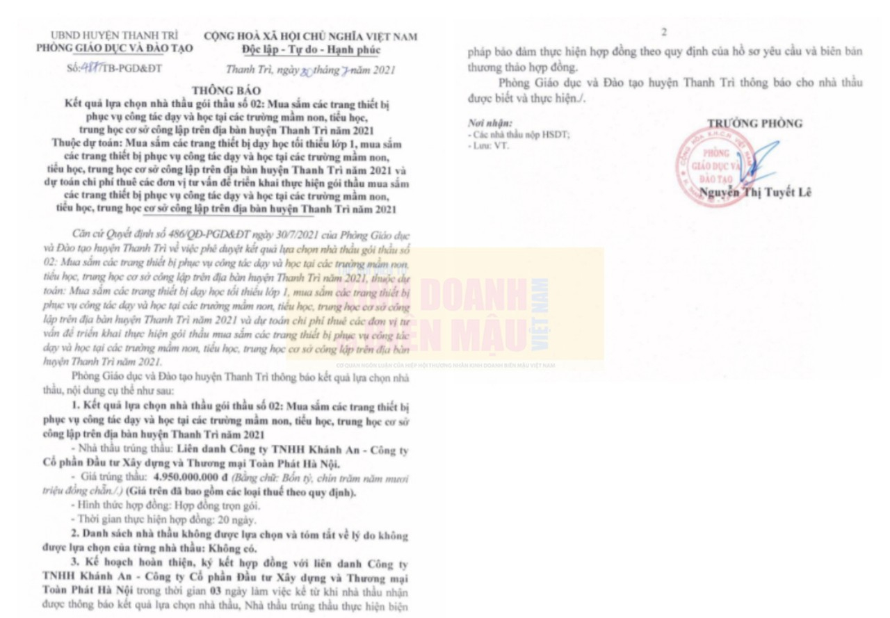 Đơn cử như tháng 7/2021 tại gói thầu số 02: Mua sắm các trang thiết bị phục vụ công tác dạy và học tại các trường mầm non, tiểu học, trung học cơ sở, công lập trên địa bàn huyện Thanh Trì năm 2021, liên danh Công ty TNHH Khánh An - Công ty Cổ phần Đầu tư Xây dựng và Thương mại Toàn Phát Hà Nội được phê duyệt trúng thầu với giá 4.950.000.000 đồng theo Quyết định số 486/QĐ-PGD&ĐT ngày 30/7/2021 do bà Nguyễn Thị Tuyết Lê - Trưởng Phòng GD&ĐT huyện Thanh Trì ký. Giá gói thầu là 5.271.640.000 đồng.