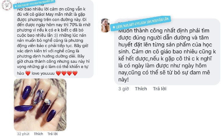 Liebe Nail Art & Eyelash hầu như không quảng cáo rầm rộ nhưng lại được đông đảo các khách hàng biết đến và tin tưởng. Hỏi ra mới biết bí quyết của Hương Quỳnh và Thảo Phương đó chính là việc tập trung đẩy mạnh vào chất lượng dịch vụ của cơ sở. Không những thế, hai chị em còn là những người vô cùng kĩ lưỡng, cẩn thận trong việc lựa chọn các sản phẩm và công nghệ nối mi, làm nail, hai cô coi việc làm đẹp cho khách hàng cũng chính là làm đẹp cho bản thân mình vậy, rất tận tình chu đáo. Vì vậy, từ khi mở cơ sở tới nay, Liebe Nail Art & Eyelash luôn cố gắng và nỗ lực hết mình để khẳng định thương hiệu, mang lại kết quả tốt nhất cho khách hàng.