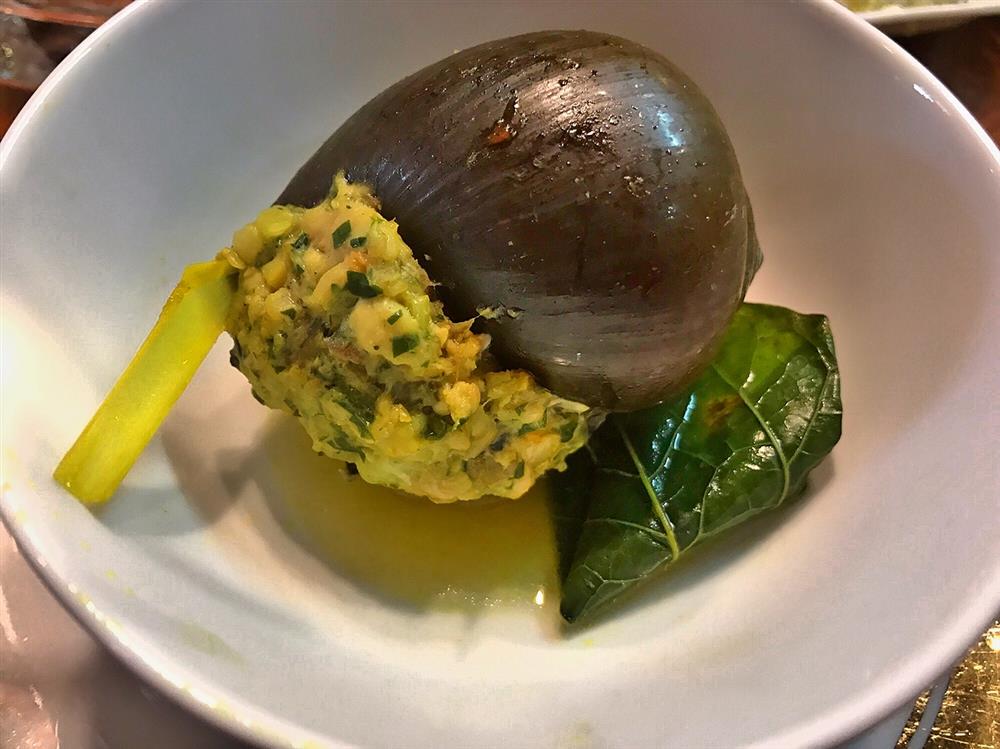Thưởng thức loại ốc nhồi to như thế này, thực khách chỉ cần bỏ dăm ba con vào một lượt, đợi ít phút rồi vớt ra thưởng thức ngay. Khi đó, ốc ngọt và giòn nhất, ăn rất sướng miệng. Nhưng ngon mấy thì thưởng thức lẩu ốc cũng cần thư thả, vì ốc là món nhiều đạm, ăn cấp tập quá dễ khiến đầy bụng, chán miệng. Hơn nữa, cái ngon, ngọt tinh túy nằm nhiều ở phần nước canh, thế nên hoa chuối, muống chẻ, tía tô… mới là “cầu nối vị giác” tuyệt vời để bạn cảm nhận vị chua-ngọt-cay-thơm đúng điệu của món ăn.