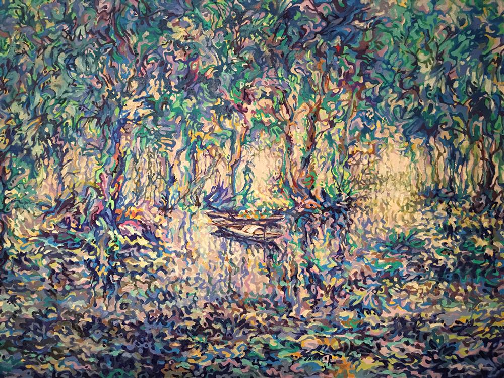 Tranh của họa sĩ Somsak Chaituch, khiến người xem cảm nhận như ông đang dệt mầu. Từng sợi mầu như những sợi vải được dệt vào nhau, xoắn xuýt nhưng không trộn lẫn, đủ phức tạp nhưng lại tách bạch, không rối rắm. Xem tranh của Somsak, dù là về cánh đồng hoa tuy líp hay ấn tượng với âm nhạc, mỗi người xem như trôi về một miền riêng mờ ảo của mình.