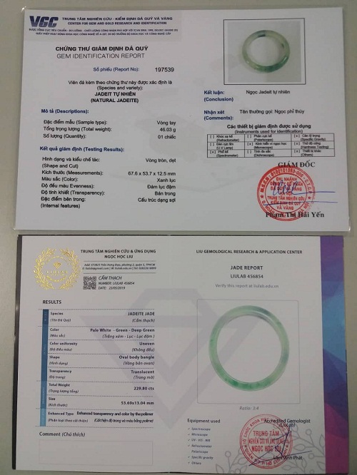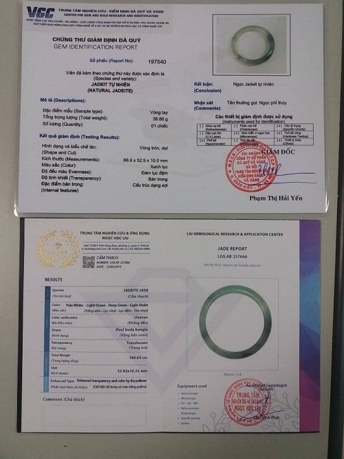 Các mặt hàng Ngọc cẩm thạch (Jadeite) chị A., mua tại đây đều có chứng thư giám định của Trung tâm kiểm định chất lượng và vàng VGC (91 Đinh Tiên Hoàng - Hoàn Kiếm - Hà Nội) kèm theo đảm bảo đây đều là các sản phẩm Ngọc cẩm thạch tự nhiên.