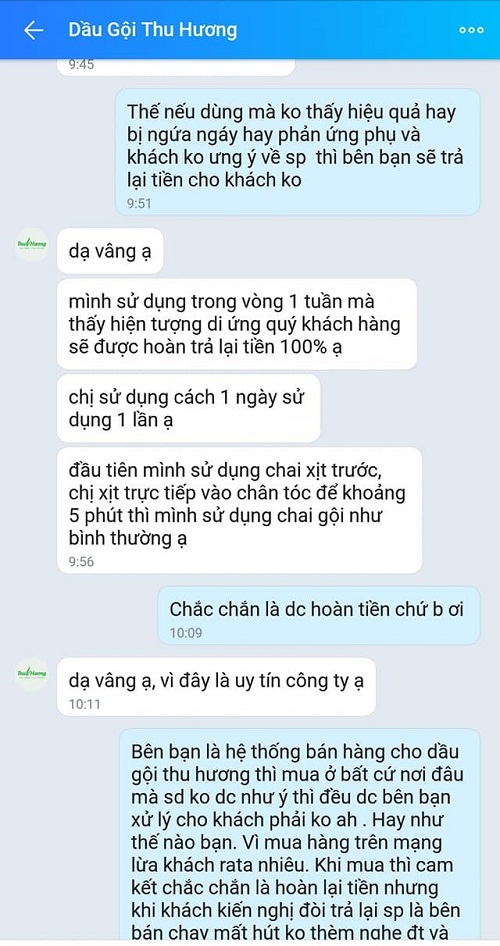 Sau khi chị thông báo không mua liệu trình tiếp theo, nhân viên của Dầu gội Thu Hương đã tư vấn chị mua thêm 1 liệu trình thuốc cải tiến mới tốt hơn, đảm bảo trị dứt điểm tình trạng và sẽ hoàn tiền 100% cả 2 lần mua nếu không có hiệu quả như cam kết. Tổng cộng, chị đã bỏ ra 1.800.000 đồng để đổi lại những đêm ngứa đầu đến không ngủ được, tóc bốc mùi khó chịu khiến chị không dám đứng gần người khác, ảnh hưởng lớn tới cuộc sống gia đình và công việc.