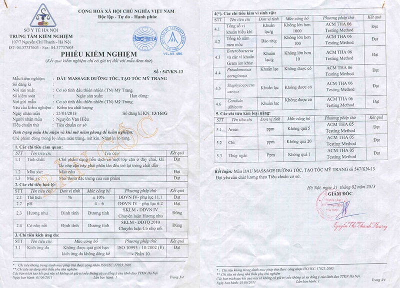 Cụ thể, trên website của Dầu gội Thu Hương quảng cáo “Sản phẩm đã được Bộ Y tế công nhận An Toàn, Hiệu Quả theo quyết định ký ngày 03/5/2013 số công bố 456/13/CBMP-HN”, nhưng lại sử dụng hình ảnh phiếu kiểm nghiệm sản phẩm số 547/KN-13 được Trung tâm Kiểm nghiệm (nay đã sáp nhập vào Trung tâm Y tế dự phòng Hà Nội), Sở Y tế Hà Nội cấp ngày 21/2/2013 cho sản phẩm Dầu massage dưỡng tóc, tạo tóc Mỹ Trang.