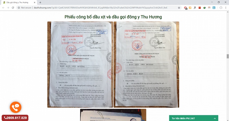Bên cạnh đó, đi kèm với những lời quảng cáo này là ảnh chụp các phiếu kiểm nghiệm sản phẩm, phiếu công bố sản phẩm mỹ phẩm do Sở Y tế Hà Nội cấp. Thế nhưng, qua quan sát kỹ, người tiêu dùng có thể nhận ra những điểm bất thường trong chính những thông tin mà Dầu gội Thu Hương đăng tải.