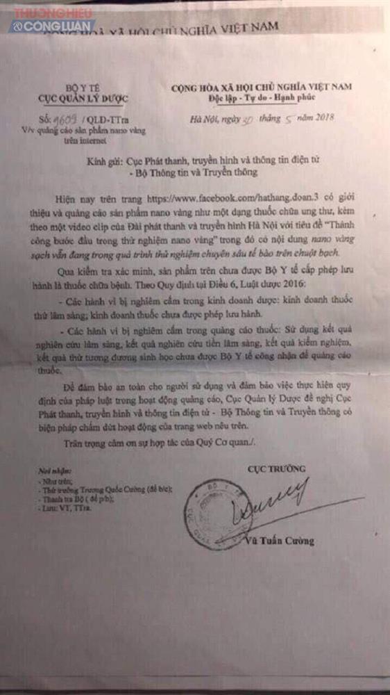 Trong công văn gửi các Sở Y tế, Thanh tra Bộ Y tế cho biết, trên một số phương tiện thông tin có đưa tin về sản phẩm nano vàng “Như một dạng thuốc chữa ung thư”, việc mua bán, sử dụng sản phẩm này diễn ra ở nhiều địa bàn trên toàn quốc. Qua kiểm tra xác minh của Cục Quản lý dược, sản phẩm nano vàng chưa được Bộ Y tế cấp phép lưu hành là thuốc chữa bệnh.