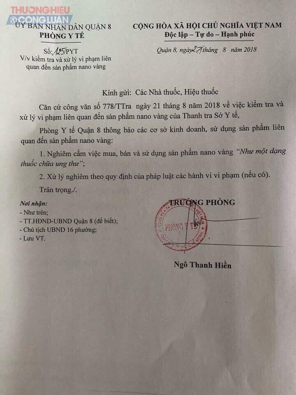 Tương tự, Sở Y tế Quảng Ninh cũng ra nội dung tương tự trong công văn 1812-SYT-TTr. Gần nhất, thực hiện chỉ đạo của Sở Y tế TP. HCM (theo văn bản 778-TTr), Phòng Y tế Quận 8, TP. HCM cũng đã gửi các hiệu thuốc trong địa bàn nêu rõ: “Nghiêm cấm việc mua bán và sử dụng sản phẩm liên quan đến sản phẩm nano vàng như một dạng thuốc chữa ung thư” và “Xử lý nghiêm các hành vi vi phạm”.
