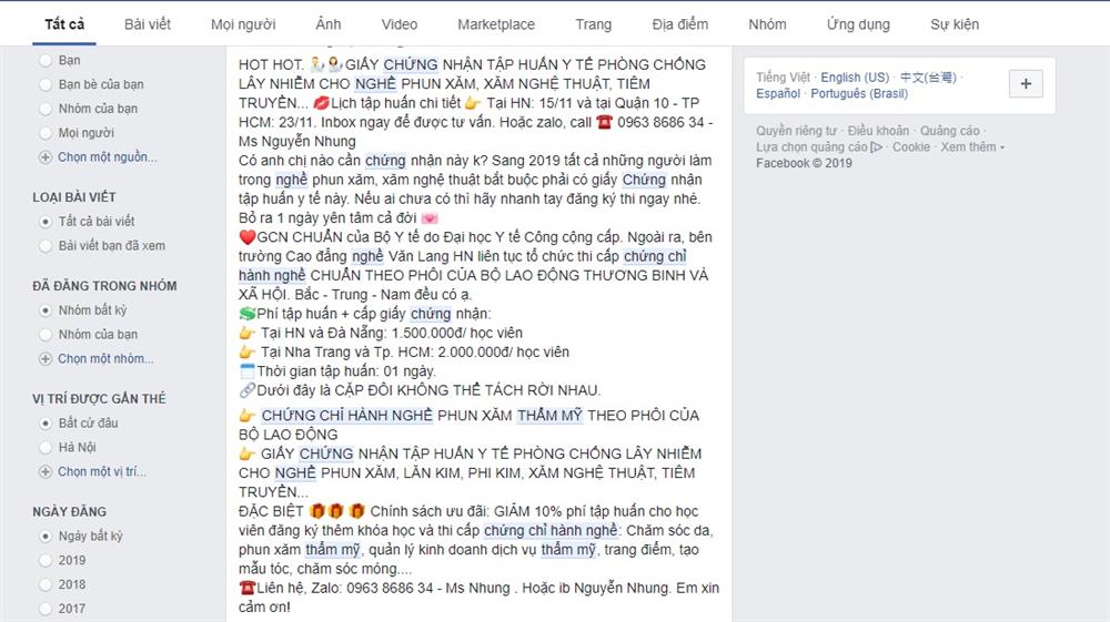 Để tỏ ra nguy hiểm hơn, có trang facebook còn tung tin đồn hòng đánh trúng tâm lý của những đối tượng có nhu cầu mua chứng chỉ như: “Sang năm 2019, tất cả những người làm trong nghề phun xăm, xăm nghệ thuật bắt buộc phải có giấy chứng nhận tập huấn y tế này. Nếu ai chưa có thì hãy nhanh tay đăng ký nhé. Bỏ ra một ngày yên tâm cả đời.”