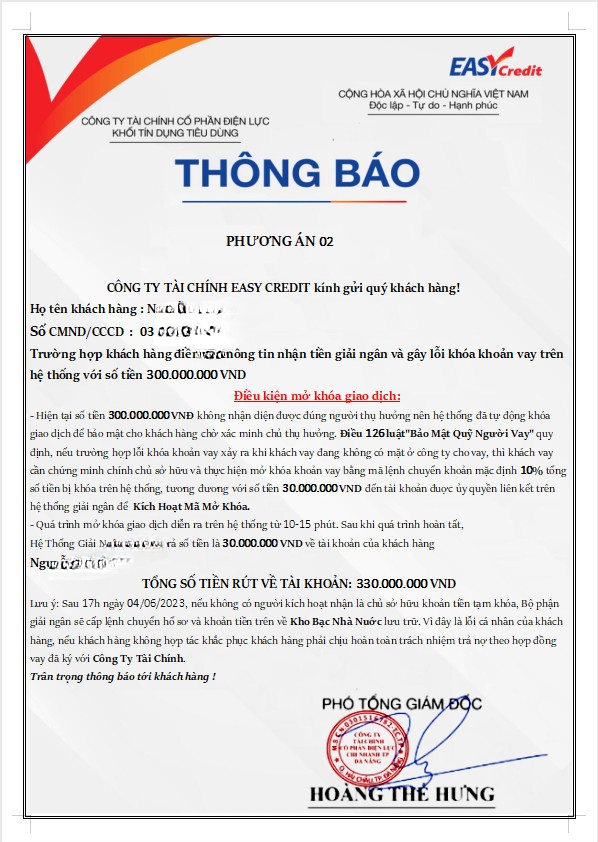 Ngay lập tức, đối tượng sử dụng zalo Hữu Lộc hướng dẫn phóng viên gọi tới tổng đài 1900272705 để được hướng dẫn. Cuộc gọi tới hotline 1900272705 của phóng viên được một đối tượng khác hướng dẫn: Anh vui lòng chuyển số tiền ký quỹ tương đương 10% khoản vay (tương đương số tiền ký quỹ là 30 triệu đồng) để được xác minh và hỗ trợ chuyển tiền về tài khoản. Kể từ đó, phóng viên liên tục nhận được cuộc gọi của các đối tượng, một mặt thúc giục phóng viên cần sớm xác minh lại số tài khoản bằng cách chuyển tiền ký quỹ về Cty. Khi phóng viên yêu cầu cung cấp số tài khoản Cty để chuyển tiền ký quỹ thì các đối tượng chế luôn một bản ủy quyền nhận tiền ký quỹ cho số tài khoản: 0564912447 của Nguyen Van Tu mở tại Ngân hàng VPBank. Một mặt các đối tượng đe dọa: Khoản vay đã được giải ngân, khách hàng phải hoàn toàn chịu trách nhiệm về khoản vay: Nếu anh không sớm xác minh lại số tài khoản, sau 24 giờ số tiền sẽ được chuyển qua Kho Bạc Nhà nước và anh sẽ phải chịu phí phạt 1%/ngày cho khoản vay ba trăm triệu đồng - đối tượng sử dụng zalo Hữu Lộc dọa dẫm.