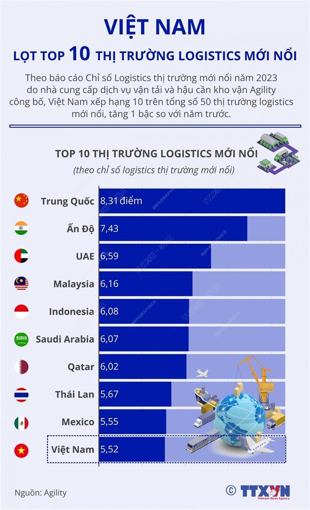Theo báo cáo Chỉ số Logistics thị trường mới nổi năm 2023 do nhà cung cấp dịch vụ vận tải và hậu cần kho vận Agility công bố, Việt Nam xếp hạng 10 trên tổng số 50 thị trường logistics mới nổi, tăng 1 bậc so với năm trước.