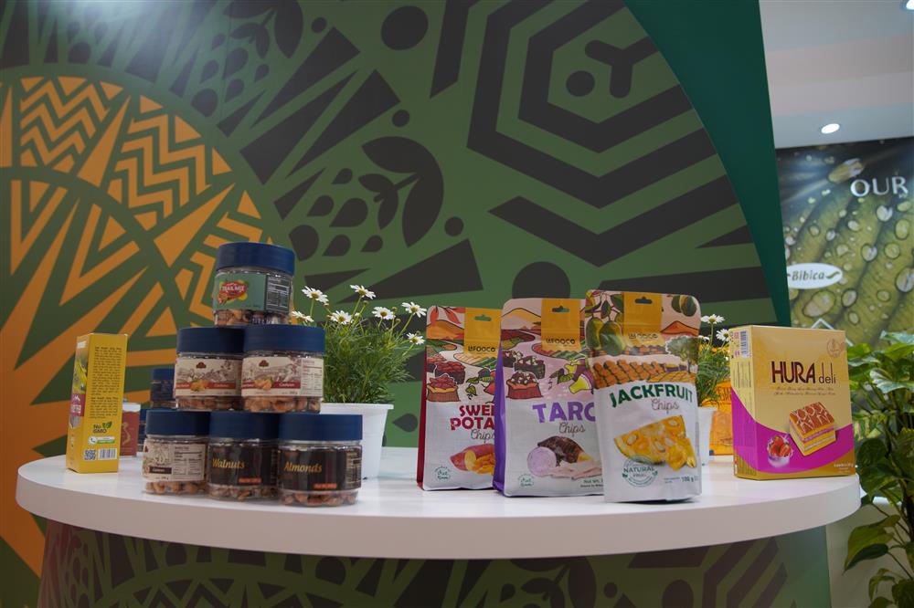 Sản phẩm hạt điều, trái cây sấy của Lafooco và Bánh Bibica tại Foodex Japan 2023 (Ảnh: PAN).