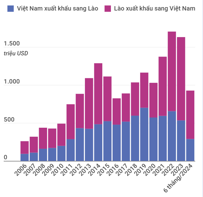 Biểu đồ thương mại song phương giữa Việt Nam - Lào qua các năm.