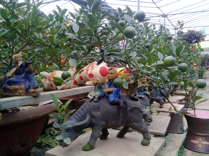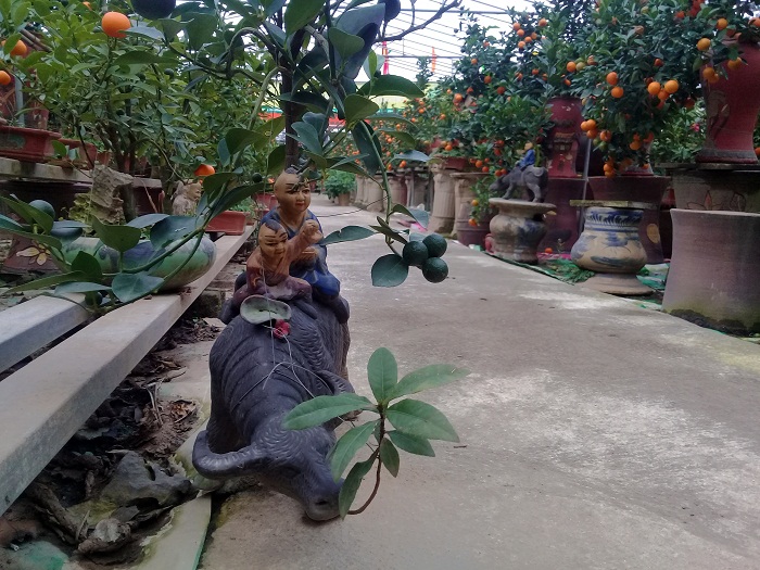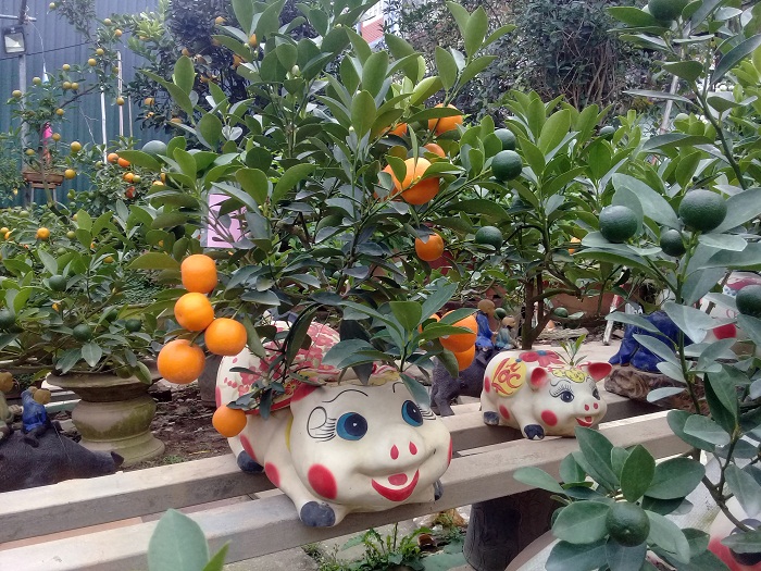 Được biết, những chú lợn, con trâu, con chó, tượng... được chủ vườn đặt mua theo đúng yêu cầu về mẫu mã, kích thước, hình dáng tại làng gốm sứ Bát Tràng (Hà Nội) sau đó mang về trồng quất vào bên trong. Những chiếc chậu cây trồng quất độc đáo này sẽ được khoét một lỗ tùy thuộc vào từng vị trí với kích thước vừa đủ để trồng một cây quất bonsai.