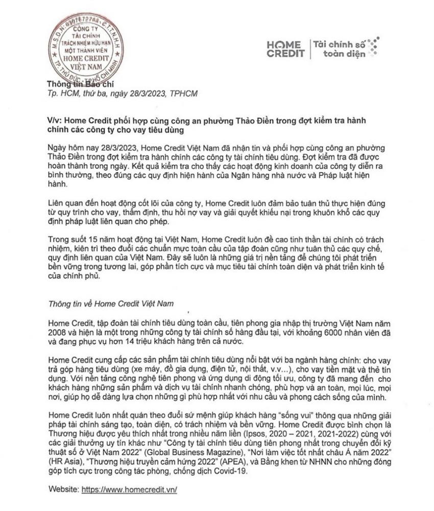 Ngày hôm nay 28/3/2023, Home Credit Việt Nam đã nhận tin và phối hợp cùng công an Phường Thảo Điền trong đợt kiểm tra hành chính các công ty cho vay tiêu dùng. Đợt kiểm tra đã được hoàn thành trong ngày với kết quả cho thấy hoạt động kinh doanh của công ty diễn ra bình thường, theo đúng quy định của Ngân hàng Nhà nước và pháp luật.
