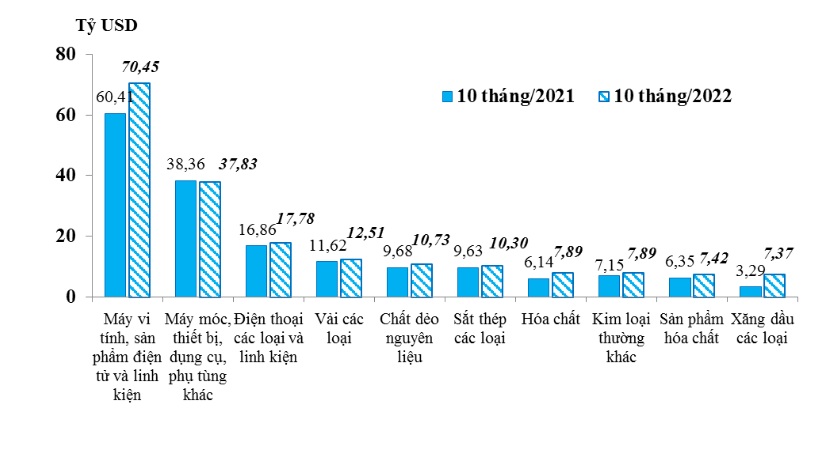 Tính đến hết tháng 10/2022, tổng trị giá nhập khẩu hàng hóa của Việt Nam đạt 303,35 tỷ USD, tăng 12,2% so với cùng kỳ năm 2021. Trong đó, tăng mạnh nhất là máy vi tính sản phẩm điện tử và linh kiện tăng 10,04 tỷ USD, tương ứng tăng 16,6%; xăng dầu các loại tăng 4,08 tỷ USD, tương ứng tăng 123,9%; hóa chất và sản phẩm hóa chất tăng 2,81 tỷ USD, tương ứng tăng 22,5%; than các loại tăng hơn 2,7 tỷ USD, tương ứng tăng 77,3%; dầu thô tăng 2,31 tỷ USD, tương ứng tăng 57,2%; nguyên phụ liệu dệt may, da giầy tăng 2,24 tỷ USD, tương ứng tăng 10,4%.