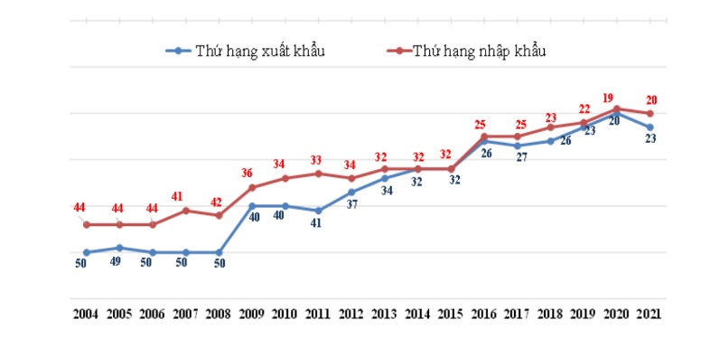 Xếp hạng xuất khẩu, nhập khẩu của Việt Nam trên thế giới trong GĐ 2004-2021(nguồn:Tổ chức Thương mại TG)