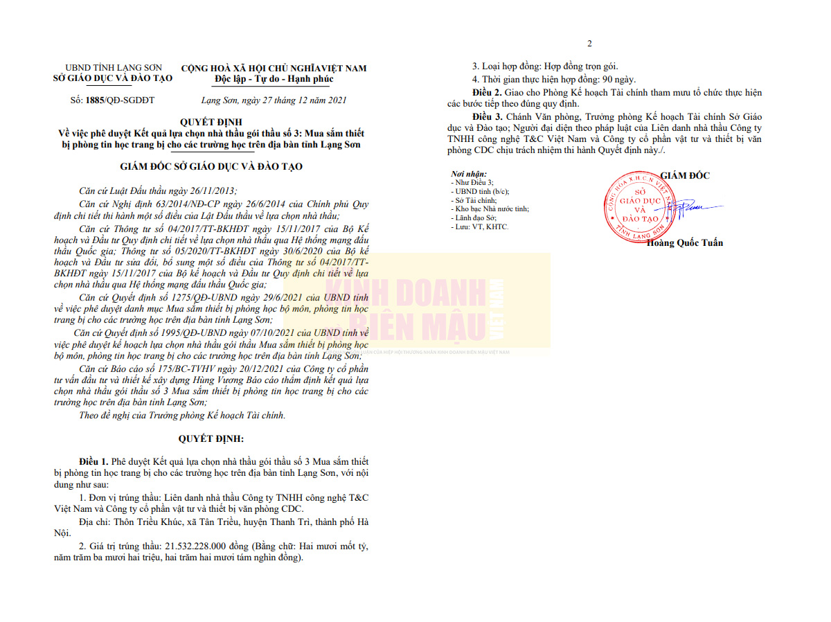 Theo tài liệu của PV, tháng 12/2021 tại gói thầu số 3: Mua sắm thiết bị phòng tin học trang bị cho các trường học trên địa bàn tỉnh Lạng Sơn, Liên danh Công ty TNHH công nghệ T&C Việt Nam - Công ty CP vật tư và thiết bị văn phòng CDC) được phê duyệt trúng thầu với giá 21.532.228.000 đồng theo quyết định số 1885/QĐ-SGDĐT ngày 27/12/2021 do ông Hoàng Quốc Tuấn, giám đốc Sở GD&ĐT Lạng Sơn ký. Giá gói thầu 21.556.842.000 đồng, tính ra tại gói thầu hơn 21,5 tỷ đồng, tiết kiệm ngân sách vỏn vẹn 24 triệu đồng. Con số quá ít ỏi.