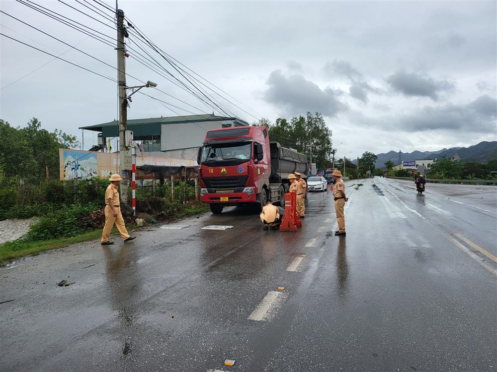 Tổ công tác Cán bộ phòng Cảnh sát giao thông tuần tra, kiểm soát bảo đảm trật tự an toàn giao thông trên tuyến quốc lộ 2 huyện Yên Sơn.