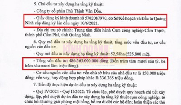 Được biết, Công ty Cổ phần Phú Thịnh Vân Đồn mới được thành lập vào tháng 6/2021, do ông Bùi Xuân Tờ làm Tổng giám đốc. Vốn điều lệ của công ty là 150 tỷ đồng, được góp vốn bởi: Bùi Xuân Tờ (40%), Phạm Văn Trưởng (25%) và Phạm Ngọc Thanh (35%).