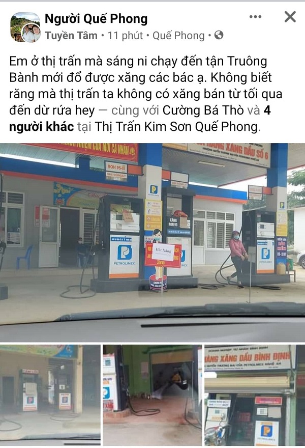 Theo ý kiến của chủ một cây xăng trên địa bàn cho biết: không biết đợt ni (này) do dịch bệnh nên hàng khan hiếm hay răng (sao) mà họ cấp nhỏ giọt lắm, không đủ bán. Hiện chúng tôi hợp tác bán lẻ cho Công ty xăng dầu Nghệ Tĩnh, họ cấp căn cứ theo sản lượng bán của 3 tháng liền kề, nhưng 3 tháng vừa qua nằm trong đợt dịch Covid 19 và thực hiện chỉ thị 16 nên lượng xăng tiêu thụ ít. Công ty xăng dầu căn cứ vào đó để cấp, nên hiện nay chúng tôi khổng đủ hàng để bán sau chỉ thị 16. Cửa hàng báo khi nào thì Công ty xăng dầu sẽ chở lên khi đó, còn trong ngày 24.10 thì một số cây xăng đã hết?