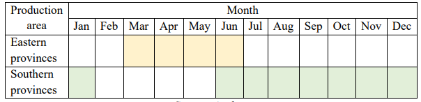 Thứ ba, sự đa dạng về nơi sản xuất và vụ mùa thu hoạch giúp nguồn cung cấp sầu riêng của Thái Lan ổn định quanh năm. Thái Lan có 2 vùng trồng cây sầu riêng lớn nhất là khu vực phía Đông gồm các tỉnh Chantaburi, Rayong, và Trad, và khu vực phía Nam gồm tỉnh Chumphon và Yala. Trong khi vụ mùa của trái sầu riêng ở các tỉnh miền Đông kéo dài từ tháng 3 cho đến tháng 6 hàng năm thì vụ mùa ở các tỉnh phía Nam diễn ra từ cuối tháng 6 cho đến tháng 1 năm sau. Đây là sự bổ sung rất tốt cho việc đáp ứng nhu cầu sầu riêng tươi quanh năm một cách ổn định. Ngoài ra, điều này còn giúp hạn chế hơn hình thức sản xuất trái vụ khiến cây sầu riêng bị hư hại và rút ngắn thời gian thu hoạch.