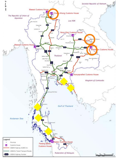 Hình 4: Bản đồ vận chuyển sầu riêng từ Thái Lan đến biên giới để xuất khẩu sang Trung Quốc. Chú thích: Vùng tròn màu cam là các cửa khẩu hải quan/ Vùng hình vuông màu vàng là những nơi sản xuất sầu riêng.