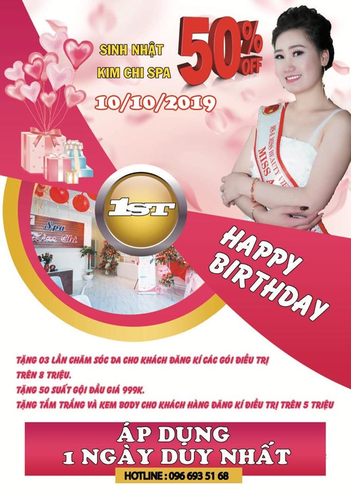 Đây là sự kiện có một không hai trong hai năm hoạt động của hệ thống làm đẹp Kim Chi spa, đừng bỏ qua cơ hội để refresh lại bản thân. Với đội ngũ nhân viên tư vấn chuyên nghiệp, hệ thống làm đẹp đẳng cấp Kim Chi spa mong muốn sẽ được đồng hành cũng bạn trong quá trình hoàn thiện vẻ đẹp của bản thân.