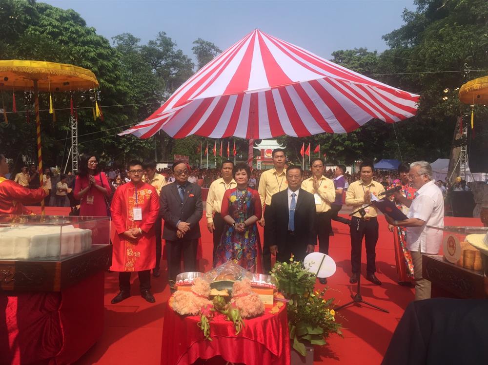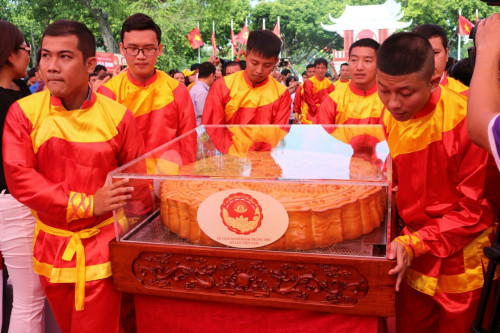Theo thông tin từ Ban tổ chức, cặp bánh trung thu này có kích thước đường kính lên tới 0.95m, dày 0.2m và nặng 1.5 tạ, tổng khối lượng cặp bánh là 3 tạ, được làm nên từ những nguyên liệu thuần Việt như: Hạt bí, đậu xanh, dưa, vừng, lạp xưởng… qua đôi tay tài hoa của những nghệ nhân đất Hà thành. Cặp bánh được rước từ đền Ngọc Sơn và diễu hành tới khu vực tượng đài Lý Thái Tổ để dâng hương.