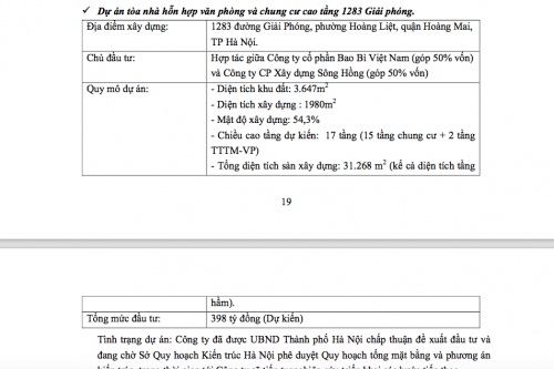 Theo báo cáo Thường niên năm 2015 của Công ty Cổ phần xây dựng Sông Hồng, Dự án nhà hỗn hợp văn phòng và chung cư cao tầng 1283 Giải Phóng là sự hợp tác giữa Công ty Cổ phần Bao Bì Việt Nam (góp 50% vốn) và Công ty CP Xây dựng Sông Hồng (góp 50% vốn). Xây dựng với chiều cao 17 tầng (15 tầng chung cư + 2 tầng TTTM – VP). Dự án đã được UBND Thành phố Hà Nội chấp thuận đề xuất đầu tư và đang chờ Sở quy hoạch Kiến trúc Hà Nội phê duyệt Quy hoạch tổng mặt bằng và phương án kiến trúc.