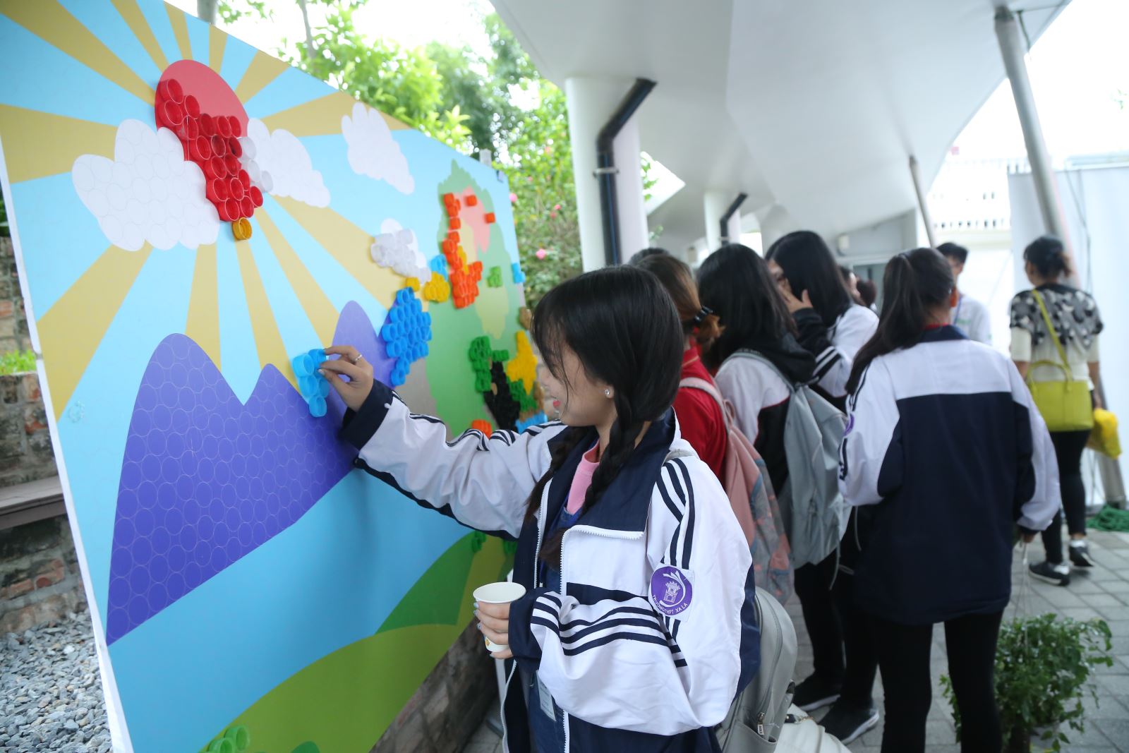 Các bạn trẻ tham gia làm tranh từ nắp chai nhựa