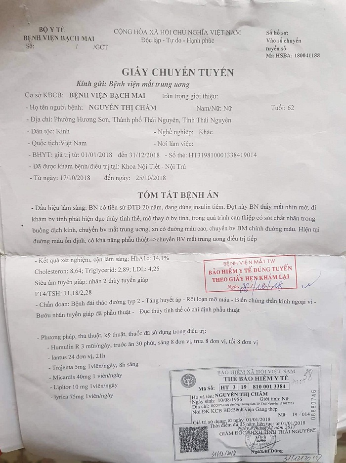 Bà Nguyễn Thị Châm (62 tuổi) ở phường Hương Sơn, TP Thái Nguyên cho biết, ngày 8/10/2018 bà có đến Bệnh viện Mắt Thái Nguyên để khám, sau khi được các y bác sỹ ở bệnh viện chẩn đoán và yêu cầu bà phẫu thuật lấy thể thủy tinh thì bà có đồng ý để bệnh viện phẫu thuật.