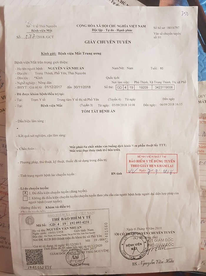 Ông Nguyễn Văn Nhuận (60 tuổi) ở xã Trung Thành, thị xã Phổ Yên, tỉnh Thái Nguyên cũng đau đớn cho hay: Ngày 5/9/2018, sau khi được các y, bác sỹ ở Bệnh viện Mắt Thái Nguyên khám và yêu cầu phải phẫu thuật, mổ mắt thay tinh thể.