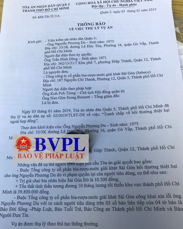 Mới đây, TAND quận 5 (TP.HCM) đã có quyết định thụ lý đơn khởi kiện của ông Nguyễn Phương Du đối với Tổng Công ty Bia - Rượu - Nước giải khát Sài Gòn (Sabeco).