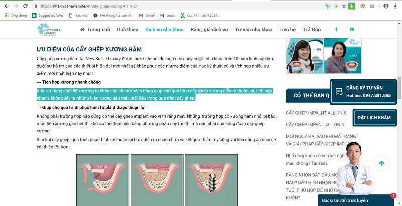 Theo đó trang web nhakhoanewsmile.vn của Nha khoa New Slime Luxury (tại 85 Bùi Thị Xuân, quận Hai Bà Trưng và 81 Lê Văn Lương, quận Thanh Xuân) ngang nhiên đăng tải nội dung quảng cáo khẳng định cơ sở này thực hiện ghép xương tự thân cho khách hàng để cắm răng. Đáng nói đây là dịch vụ không được cấp phép tại các phòng khám nha khoa theo quy định của Bộ Y tế.
