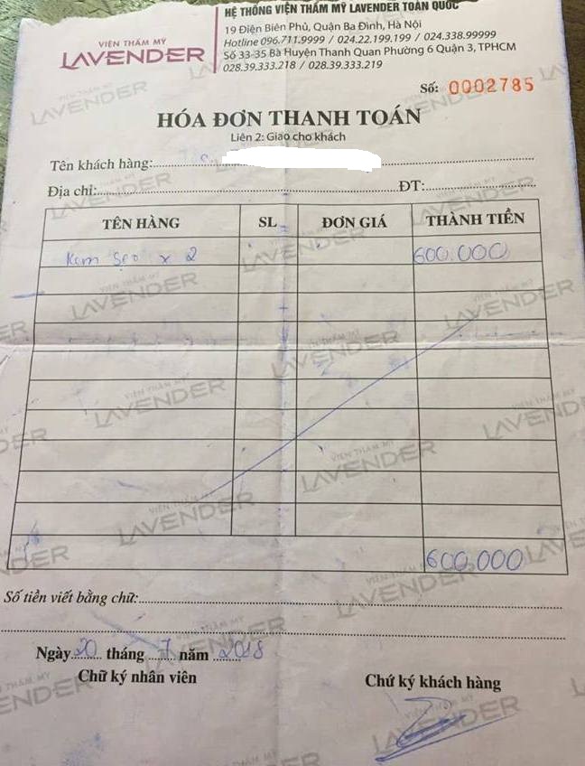 Theo phản ánh của chị D.T.T, sau khi nộp tiền thực hiện dịch vụ nâng cung mày và cắt da thừa trị giá hơn 20 triệu đồng tại Thẩm mỹ viện Lavender nhưng khách hàng không được cơ sở này xuất hóa đơn đỏ theo quy định. Tòa soạn sẽ liên hệ với cơ quan thuế để làm rõ nội dung này.