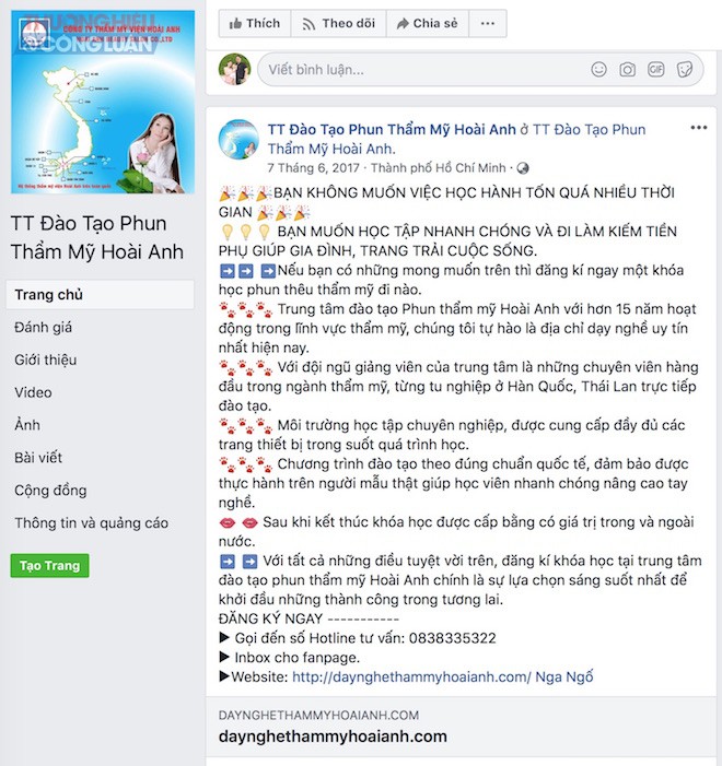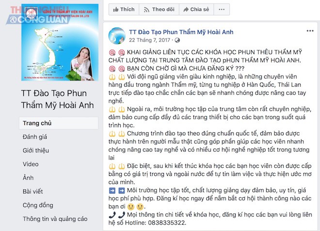 Trên trang Facebook có tên “TT Đào Tạo Phun Thẩm Mỹ Hoài Anh” có địa chỉ tại số 18 Lý Thái Tổ, Phường 2, Quận 3, TP. HCM, là một chi nhánh của TMV Hoài Anh, đăng tải rất nhiều thông tin về các khoá học nghề phun xăm và nhận được nhiều sự quan tâm của các học viên.