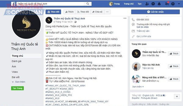 Thời gian gần đây, tòa soạn đã nhận được phản ánh của khách hàng về việc cơ sở Thẩm mỹ Quốc tế Thúy Anh (có địa chỉ tại số nhà 60, đường Kim Ngưu, phường Thanh Nhàn, quận Hai Bà Trưng) hoạt động, quảng cáo công khai làm các dịch vụ như nâng mũi độc quyền Perfect line, sửa mũi lỗi, cải thiện mũi tiêm filler, bóc mỡ mí mắt, sụp mí, giảm béo an toàn, liệu trình nhanh chóng, độn cằm, tạo hình môi không phẫu thuật, Filler an toàn 100%...với nhiều mức giá khác nhau.