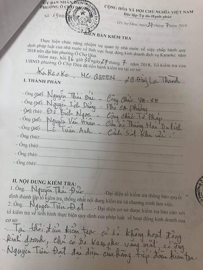 Biên bản kiểm tra quán karaoke MC Queen được lập hồi tháng 7 năm 2018.