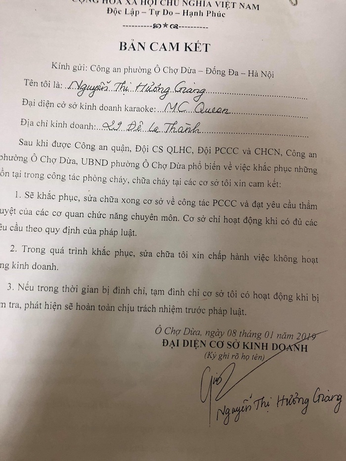 Tại các buổi làm việc, cơ sở này đã hứa và ký các bản cam kết về việc chỉ hoạt động khi đủ điều kiện về PCCC, chấp hành các chủ trương, chính sách, pháp luật của Đảng và Nhà nước, cũng như yêu cầu của địa phương