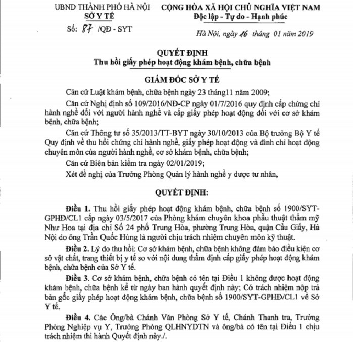 Căn cứ vào Biên bản kiểm tra của Sở Y tế Hà Nội ngày 02/01/2019 và đề nghị của Trưởng Phòng Quản lý hành nghề y dược tư nhân, ngày 16/1, bà Trần Thị Nhị Hà – Phó Giám đốc Sở Y tế Hà Nội đã ký quyết định thu hồi giấy phép khám chữa bệnh số 1900/SYT-GPHĐ/CL1 cấp ngày 03/05/2017 của Phòng khám chuyên khoa phẫu thuật thẩm mỹ Như Hoa tại địa chỉ số 24, phố Trung Hòa, phường Trung Hòa, quận Cầu Giấy, Hà Nội.