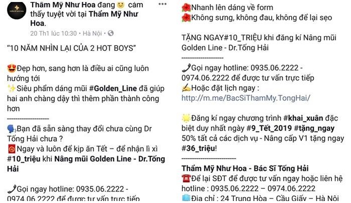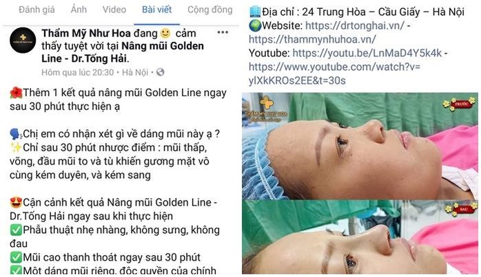 Tuy nhiên, theo ghi nhận của PV, cho đến thời điểm hiện tại (ngày 21/1) trên website https://thammynhuhoa.vn/ và trên trang facebook Thẩm Mỹ Như Hoa của Phòng khám chuyên khoa phẫu thuật thẩm mỹ Như Hoa (https://www.facebook.com/pg/VienThamMyNhuHoa) vẫn đăng tải và quảng cáo những dịch vụ phẫu thuật thẩm mỹ như nâng mũi, cắt mí, độn cằm…