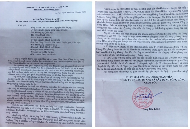 Vị Giám đốc Công ty Sông Hồng cho hay, từ năm 2016 đến nay việc kinh doanh trong lĩnh vực công trình xây dựng tại địa bàn Huyện Phú Xuyên của doanh nghiệp gặp nhiều khó khăn; Nguyên nhân là do bà Phạm Hải Hoa Bí thư Huyện sử dụng quyền lực của mình thông qua các chỉ đạo điều hành không tuân thủ các qui định của Đảng và Nhà nước gây khó khăn cho Doanh nghiệp.