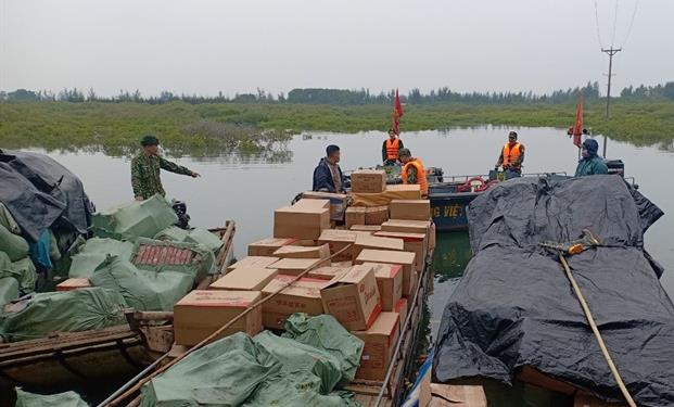 Qua kiểm tra, lực lượng phối hợp phát hiện trên 2 mảng xốp đang vận chuyển 20 thùng cát tông, bên trong chứa bánh kẹo, có trọng lượng 200kg và 26 bao tải bên trong chứa sủi cảo, có trọng lượng 2,6 tấn.