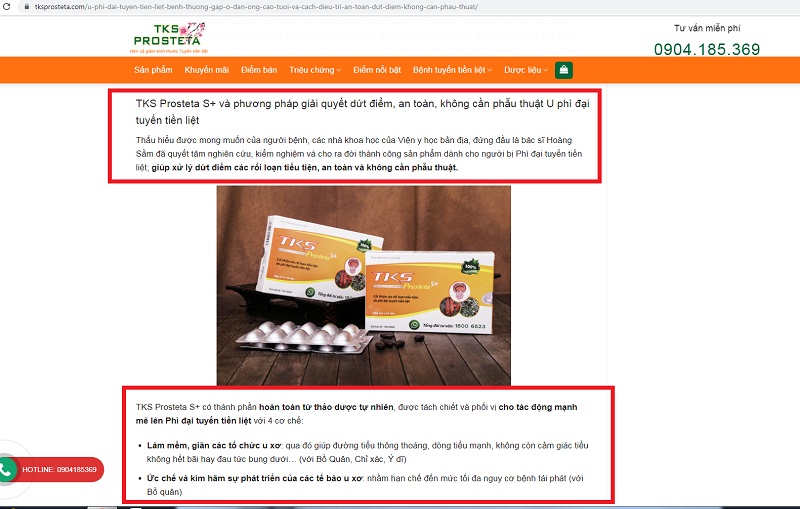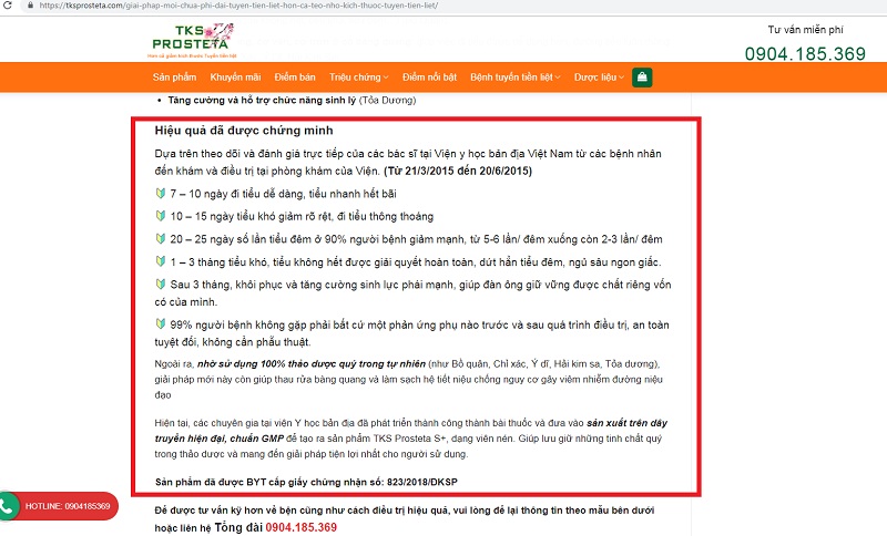 Nội dung quảng cáo trên web: tksprosteta.com, nói về ông Thoa sau khi dùng 3 tháng TKS thì khỏi hoàn toàn phì đại tiền tuyến liệt.