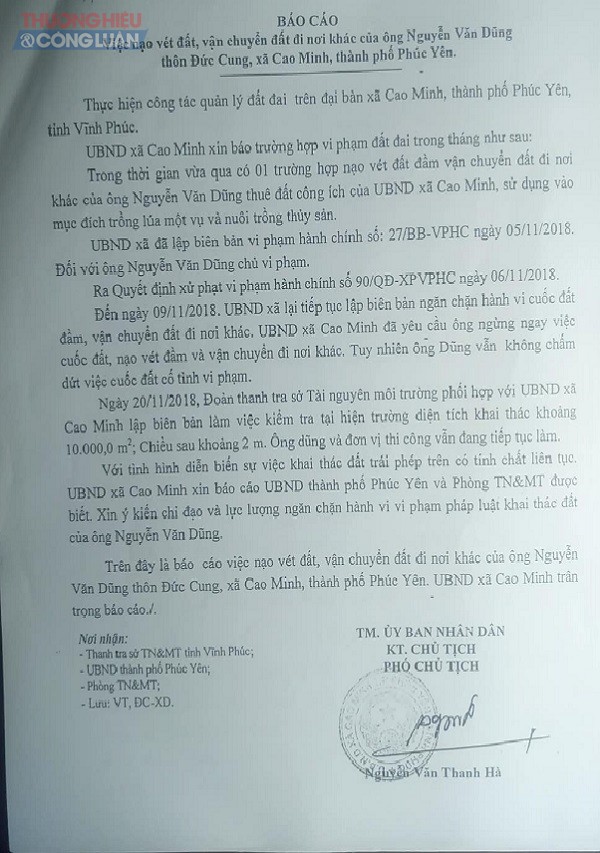 Một bản báo cáo của UBND xã Cao Minh gửi các cơ quan chức năng tỉnh Vĩnh Phúc.