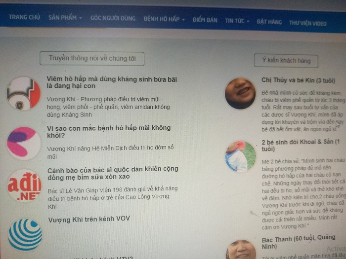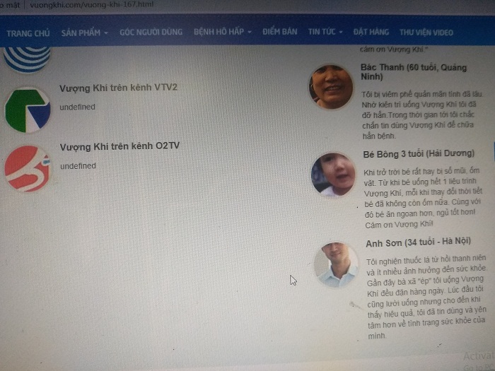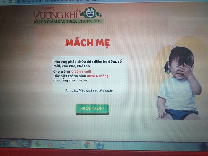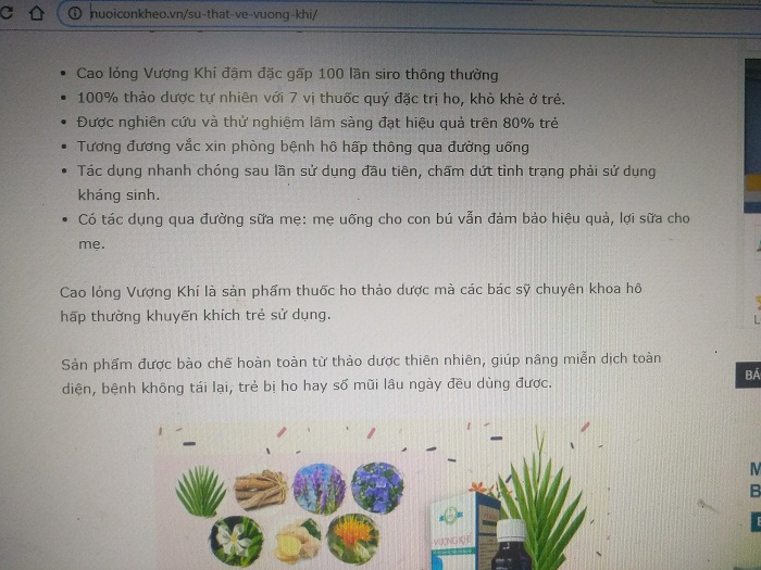 Nhưng trên một số website như : http://vuongkhi.com/; https://nuoiconkheo.vn; fanpage facebook lại “thổi phồng” về công dụng của sản phẩm như: dùng cho người mắc viêm họng cấp và mạn tính, viêm amidan, viêm thanh quản,điều trị ho gió, ho khan, ho có đờm, ho tái đi tái lại, đau rát cổ họng, nhiều đờm.