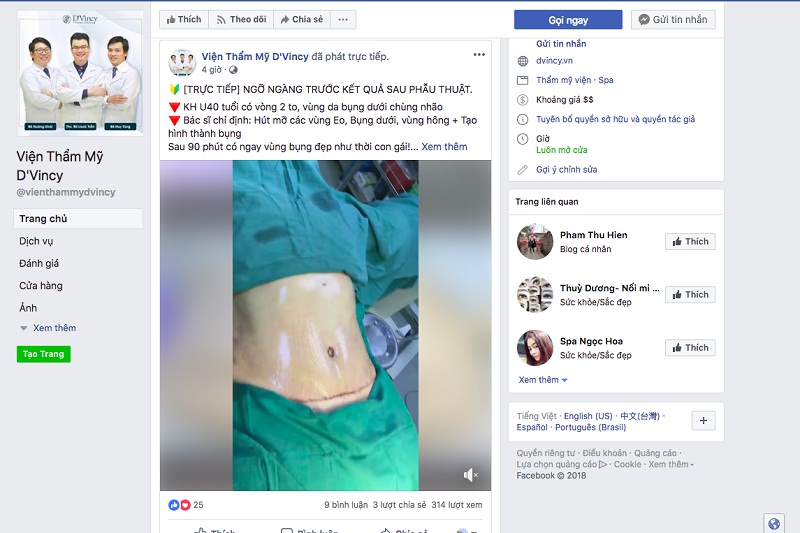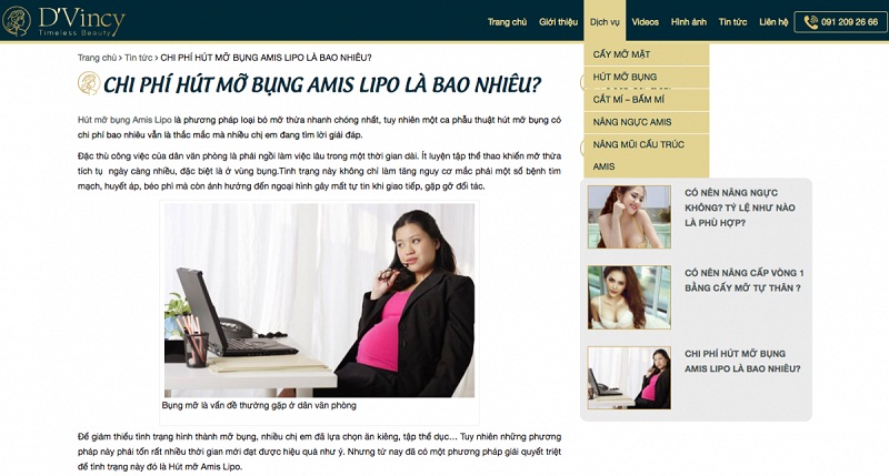 Chỉ cần vào trang web: www.dvincy.vn đã xuất hiện hàng loạt các dịch vụ như cấy mỡ mặt, hút mỡ bụng, nâng ngực… được quảng cáo rất cụ thể và chi tiết. Không những thế, những clip quảng cáo trên trang web còn thể hiện việc phẫu thuật được thực hiện tại viện thẩm mỹ D’Vincy.